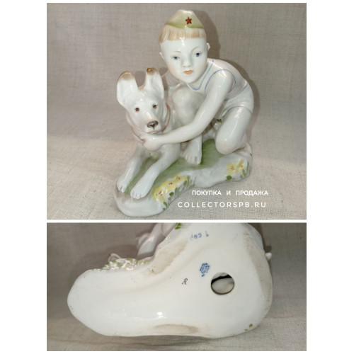 Статуэтка "Юный пограничник" (мальчик с собакой овчаркой в пилотке). Фарфор ЛФЗ СССР. (5,5/2,5_Сав)